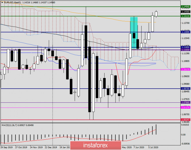 Secara teknikal, terdapat dua perkara yang perlu diberi perhatian. Pertama, pasangan euro / dolar dengan yakin melepasi moving average eksponensial. Kedua, perdagangan ditutup di atas tahap rintangan penjual yang kuat di 1.1422, yang kemungkinan besar bermaksud penembusan harga pada tahap ini. Perlu juga diperhatikan bayangan atas graf lilin mingguan yang agak kecil, yang menunjukkan kekuatan dinamik menaik.