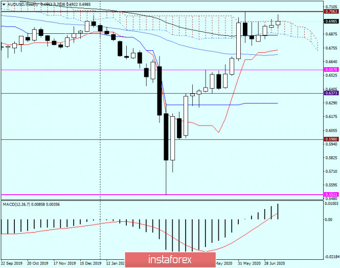 Sekiranya pasaran memilih senario penurunan, pasangan berisiko jatuh ke zon harga 0.6922-0.6907, di mana nilai perdagangan minimum adalah pada 14 Julai, serta garis Kijun indikator Ichimoku.