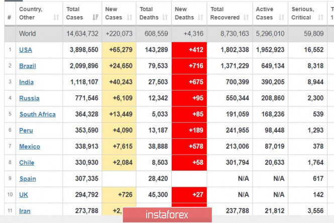 Walaupun begitu, nampaknya terdapat kemajuan, berikutan daripada terdapat penurunan jumlah jangkitan di Amerika Syarikat dan Brazil, yang mencatatkan penurunan dalam jumlah kejadian harian masing-masing kepada 65 ribu dan 25 ribu.