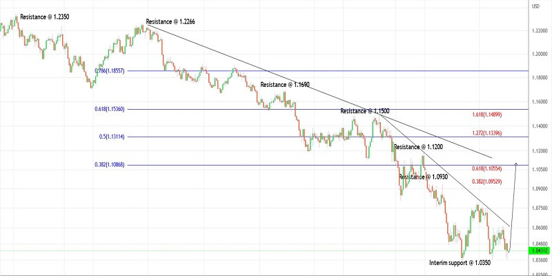 EURUSD telah menurun daripada paras tinggi 1.2350 sejak Januari 2021, mencatatkan paras rendah yang lebih rendah dan paras tertinggi yang lebih rendah. Ayunan menurun baru-baru ini boleh dilihat antara 1.2266 dan 1.0350 seperti yang ditandakan pada carta harian. Sebaik-baiknya, harga harus menjejaki semula sempadan terkini di atas sekurang-kurangnya sehingga kawasan 1.1086-1.1100, iaitu tahap Anjakan semula Fibonacci 0.382.